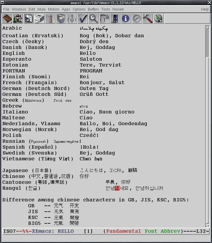 给大家看一张 emacs 的截图,看看上面的这么多语言的文字共同显示,这个会是用 GB2312/GBK/GB18030 的编码么?
