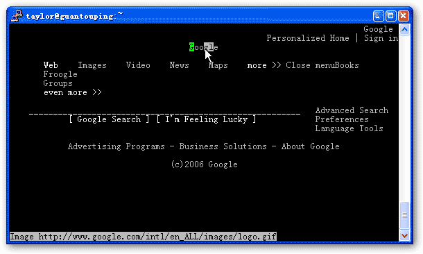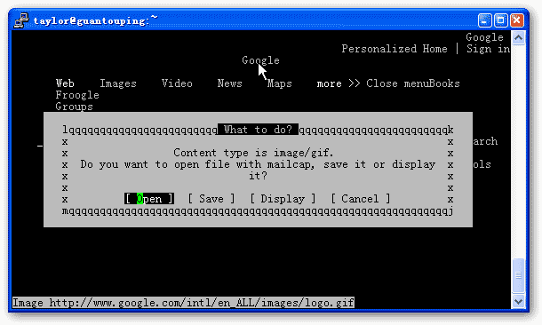 看下面的这个图片,用 Links 打开了 Google 的首页,用鼠标去选中 顶部中间的 Google,我们会发现,弹出了保存的对话框。