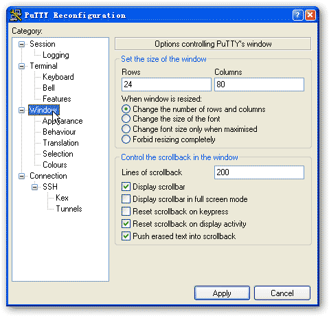 默认情况下,Putty的输出显示最多200行,也就是说你cat一个500行的文件,它只能显示出最后的200行,你要通过滚动条看前300行的内容是看不到的,幸亏这个值可以配置,具体位置是category->window下,将Lines of scrollback 由缺省的200改成一个更大的值,我改成了2000。