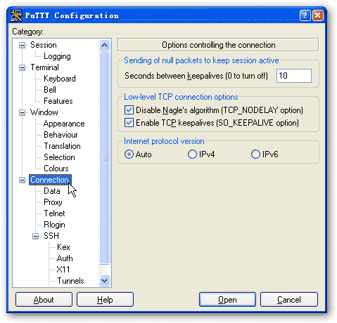 在 Connection 里面有个 Seconds between keepaliaves,这里就是每间隔指定的秒数,就给服务器发送一个空的数据包,来保持连接。以免登录的主机那边在长时间没接到数据后,会自动断开 SSH 的连接。