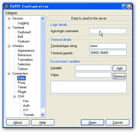 在 Connection-〉Data 里面有个 Auto-login username,可以指定默认的登录用户。如果每次登录主机都是用同一个用户,不妨在这里设置一下。SSH、Telnet、Rlogin 这三种协议都支持,但不是所有的 Telnet 服务器支持自动登录用户