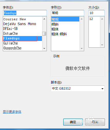 在字体中找到"Fixedsys"字体并选中它,其它默认就行,然后点击"确定"按钮保存设置。