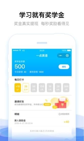 新用户登录即有奖学金红包!同时在一点英语的学习过程中,随着学习时间不断增加,奖学金也不断累积,奖学金可真实提现为现金哦!