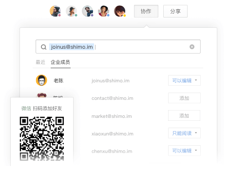输入邮箱,或用微信扫一扫,添加好友开始协作;