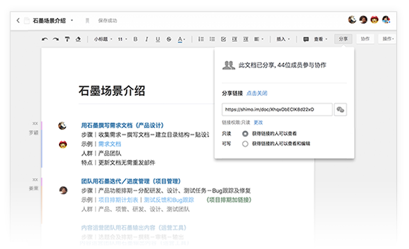 石墨文档帮助你的企业或小组提升创新性、连接性和信息的同步性。无论是上线一款产品,或策划一场活动,石墨将所有人员统筹于一个页面,团队在协作中走向高效。