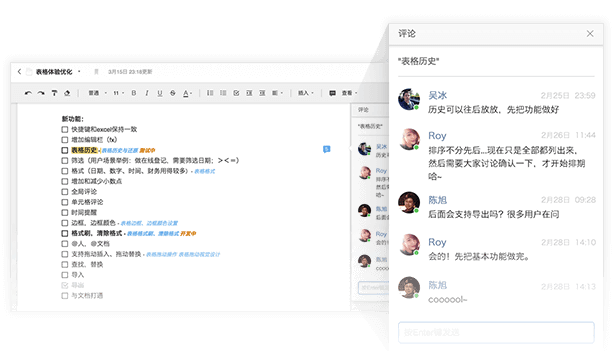 文档内讨论、提及协作者、查看历史,及时跟进项目进展