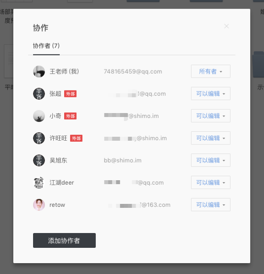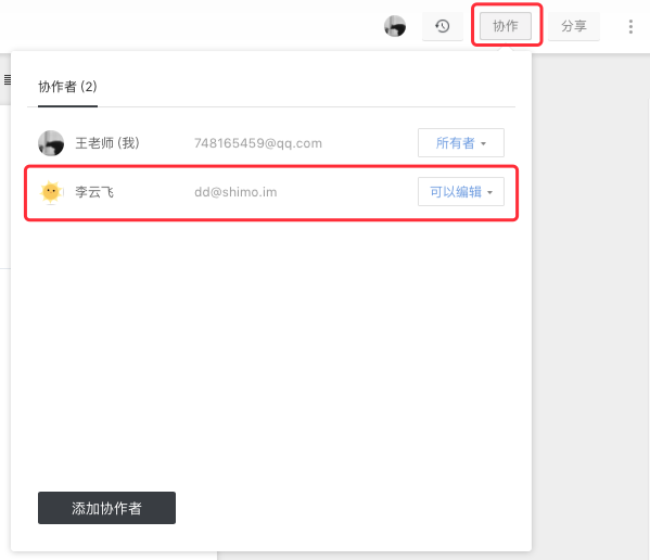 打开文档后,点击文档右上方的「 协作 」按钮,可以看到文档中的协作者及协作权限,如下图所示: