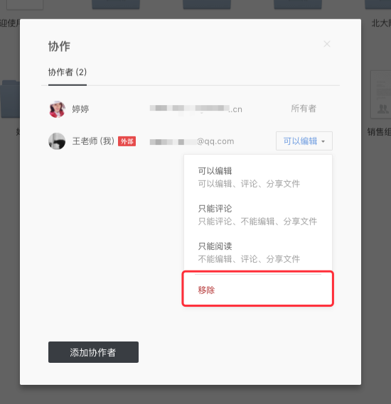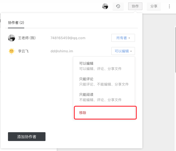 取消文档/表格协作者的权限方法一:在文档/表格内将协作者移除