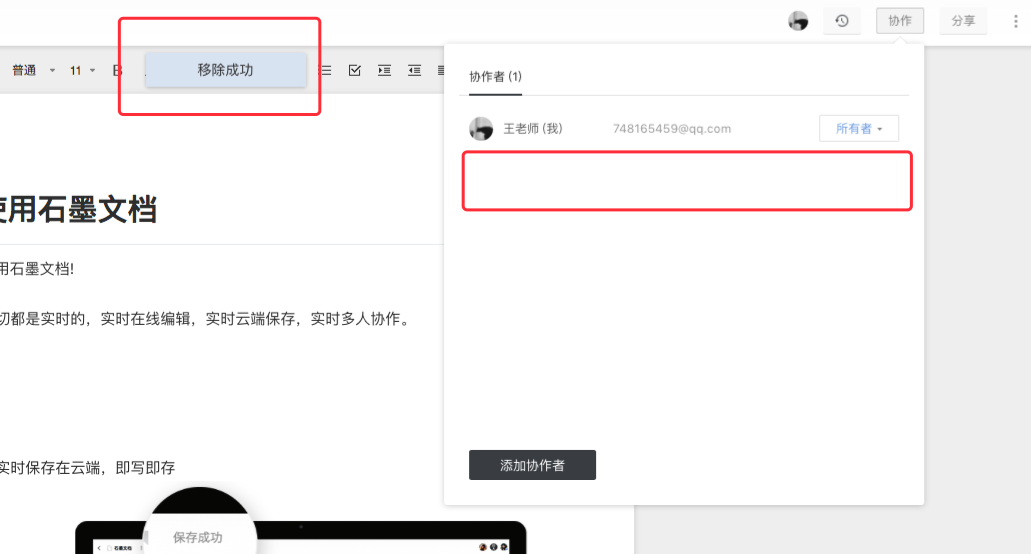 收到移除成功的提示,该成员从协作列表中消失,如下图所示: