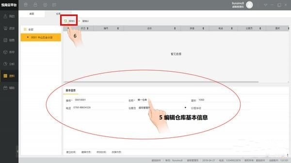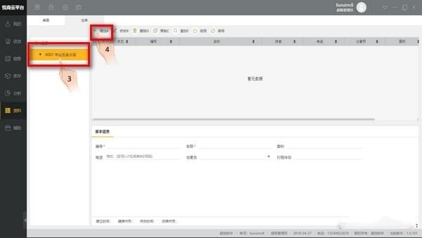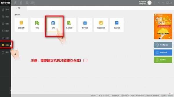 打开软件选择“资料”在里面选择“仓库”(这里需要建立机构才能建立仓库)