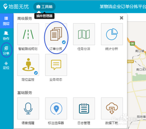 在工具箱中开启“订单分拣”插件,进入“分单”面板,输入订单地址( excel 文件/API ),可快速精确的将订单分配至对应的业务区域。