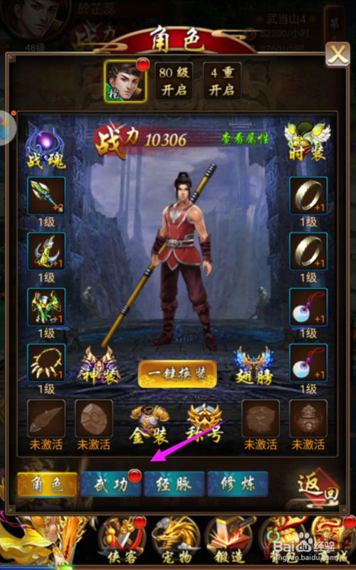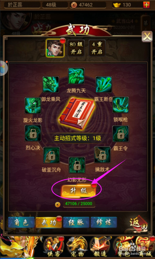 侠行天下的【武功】界面,我们继续操作,我们点下【升级】,如图。