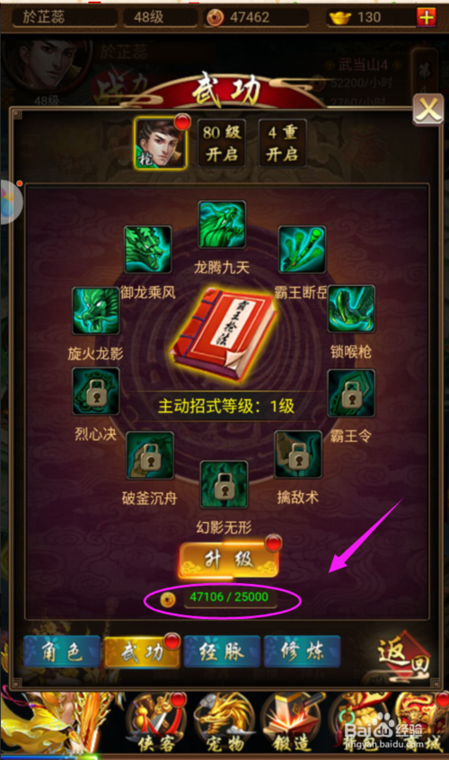 侠行天下的【武功】每次升级,需消耗掉25000铜钱,如图。