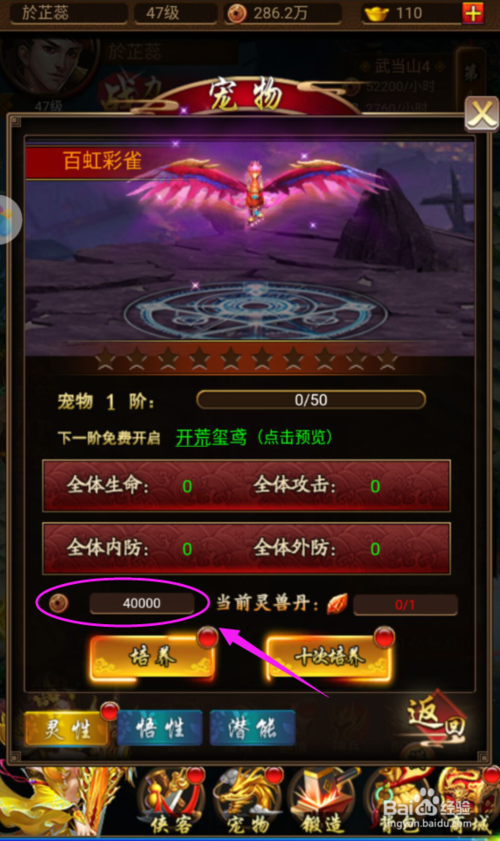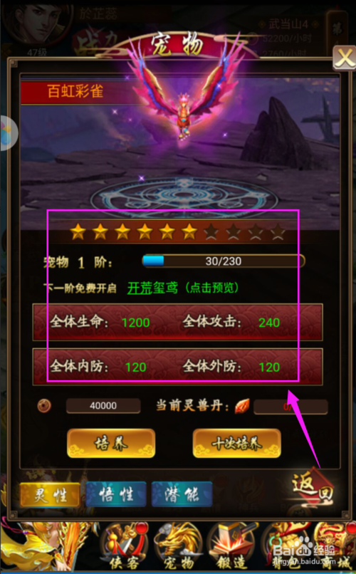 我们就可以发现宠物得到了升阶,并且我们看到宠物的生命值、攻击力等都得到了一些提升,如图。
