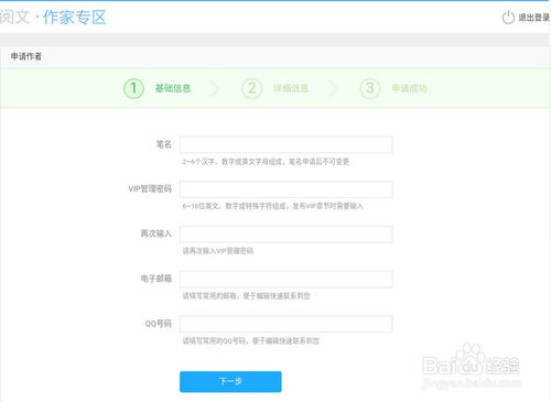 之后出现如图申请作者的页面,填写申请信息。笔名一定要自己想好了再填哦。