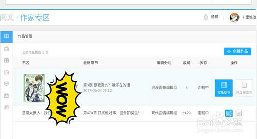 申请好后,再点击左边蓝色部分,如图所示,会有新建作品是字样,点击。选择是男频还是女频,之后会要你填写作品名,简介之类的。创建作品要先上传两千字以上进行审核,审核通过之后才能搜索到自己的作品。
