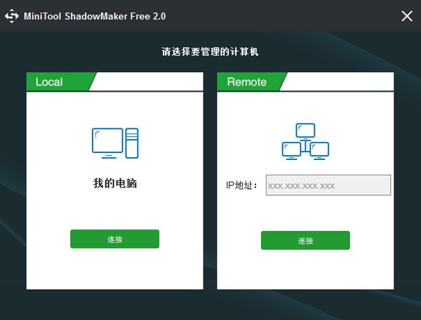 第一步,打开MiniTool ShadowMaker时需要选择本地备份或远程备份。然后点击连接进入主界面。