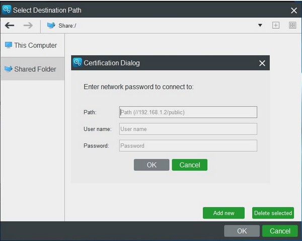 另外,您还可以在共享文件夹中点击添加新目标,来输入路径、用户名和密码,选择将磁盘备份镜像保存到共享文件夹。