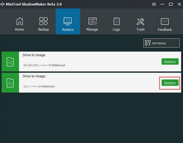 第一步,在还原页面,列出所有备份任务。请选择您想要恢复的系统备份,点击还原按钮。