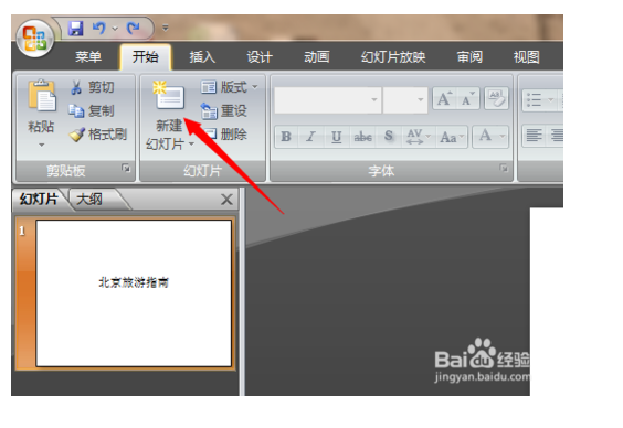 5、鼠标左键单击“开始”以后,在其下方找到“新建幻灯片”,并且点击“新建幻灯片”。