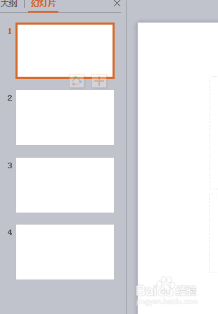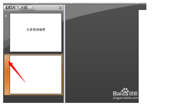 6、点击打开了“新建幻灯片”以后,可以看到ppt左侧的幻灯片新增了一个小格子。这个小格子也给出了序号2,现在就是需要对该幻灯片进行编辑,在右侧的操作界面中进行操作。