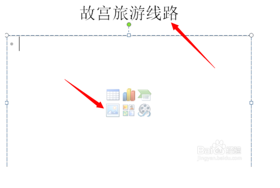 7、这个幻灯片也有一个小标题,比如写作“故宫旅游线路”。在标题栏中输入文字,然后在下方的内容填充栏里,可以写一些文字,对标题内容加以说明,还可以添加图片、表格等等。完成后,再重复步骤7,直到该ppt文件编辑完成为止。
