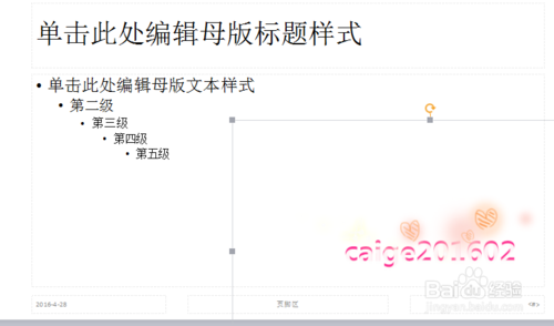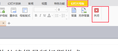 4、点击插入的水印,按del键或backpace删除,然后关闭幻灯片母版。