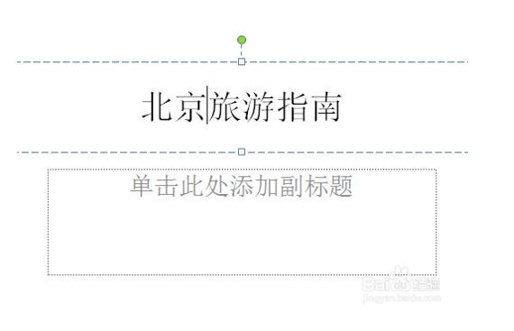 3、比方说我准备做一个“北京旅游指南”的ppt文件,那么在这个标题栏里输入“北京旅游指南”。这样,该ppt文件的标题就完成了。当然,你还可以写一个副标题。