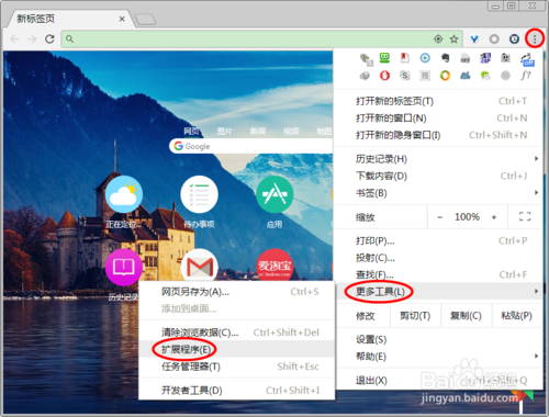 点击Chrome浏览器右上角的自定义及控制按钮,在下拉框中选择更多工具选项,然后点击扩展程序来启动Chrome浏览器的扩展管理器页面。
