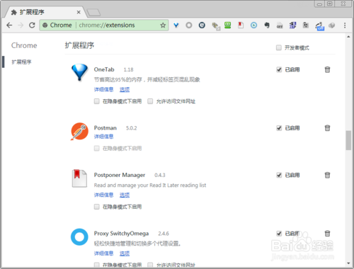 在打开的Chrome浏览器的扩展管理界面中,可以看到已经安装的Chrome扩展程序。