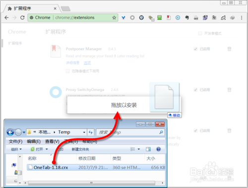 找到已经下载到的Chrome离线扩展程序安装文件xxx.crx,然后将其从资源管理器中拖拽到Chrome的扩展管理中,这时候用户会发现在扩展程序界面中会多出一个"拖放以安装"的信息提示。