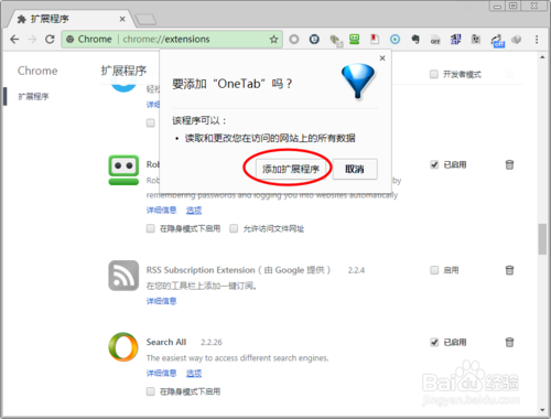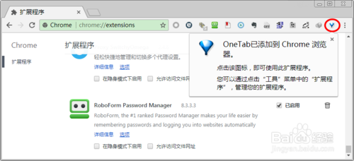 点击添加按钮就可以把该离线Chrome扩展程序安装到Chrome浏览器中去,安装成功以后该扩展程序会立即显示在浏览器右上角(如果有扩展程序按钮的话),如果没有扩展程序按钮的话,用户还可以通过Chrome扩展管理器找到已经安装的扩展程序。