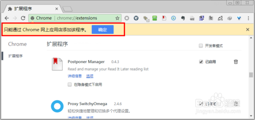 由于一些特殊原因,极个别Chrome插件在使用上述的安装方法的时候,Chrome会提示"只能通过Chrome网上应用商店安装该程序"。