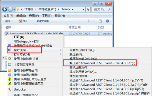 右键点击该文件,并使用压缩软件(如魔方压缩、360压缩等)对该压缩文件进行解压,并保存到系统的一个任意文件夹下。
