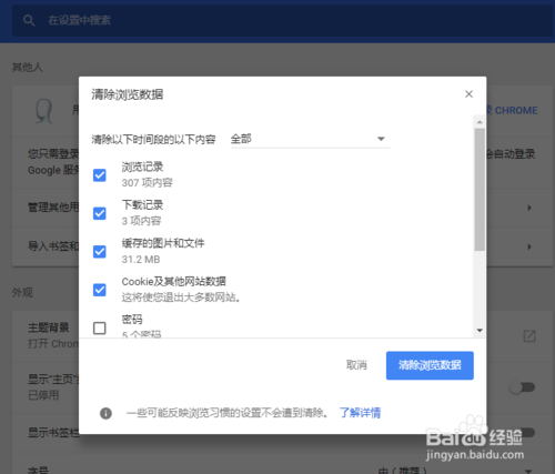 点击上图2中的“清除浏览数据”,浏览器将弹出设置页面中“清除浏览数据”的对话框,如下图所示。