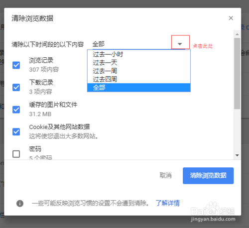 首先请先选择要清除的时间段,默认是“全部”,点击下图中标红的箭头,可以看到其他选项,请根据自己的需要选择不同的时间段。