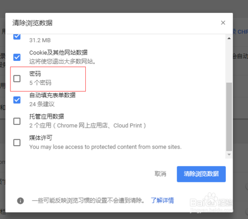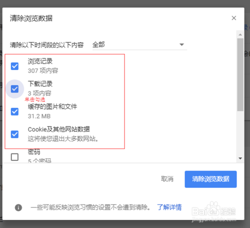 在勾选清除内容的时候,请注意以下截图中标红的项,如果把“密码”选择勾上,那所有的网页的用户名和密码将会被清除,所以在勾选这一项的时候请慎重,如果清除了,导致登录某些网站要重新输入密码。