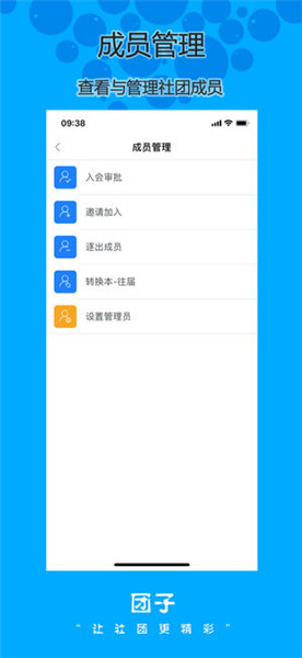 管理社团成员,设置管理员、审批加入申请、编辑成员角色信息等;