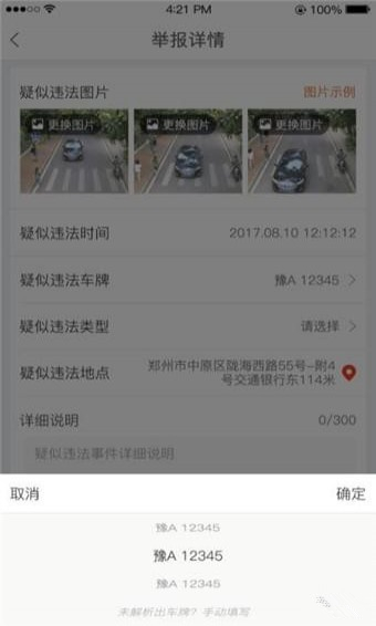 系统自动解析出车牌,确认下是否解析正确,如果车牌错误可手动修改;