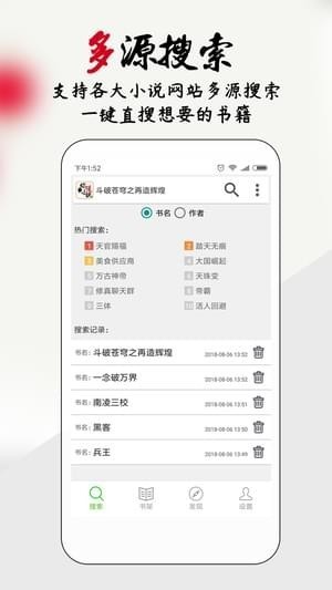 支持各大小说网站多源搜索,一键直搜想要的书籍,自动筛选归纳整理搜索结果中的书源。提供热门搜索词,搜索记录,方便通过书名或作者直达搜索内容。