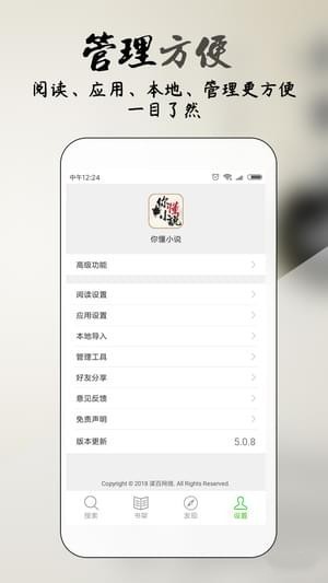 阅读设置、应用设置、本地导入、管理工具、好友分享、版本检测更新。