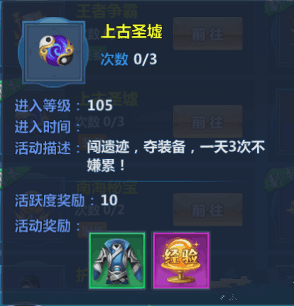 上古圣墟副本可是提供装备和海量经验的重要来源之一。开启等级是105,每天最多参与3次,十分重要!