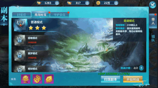 南海秘宝可是可以获得大量铜钱的每日必做单人副本!一天两次。Vip根据等级不同,还会有每日额外的可购买次数的福利。