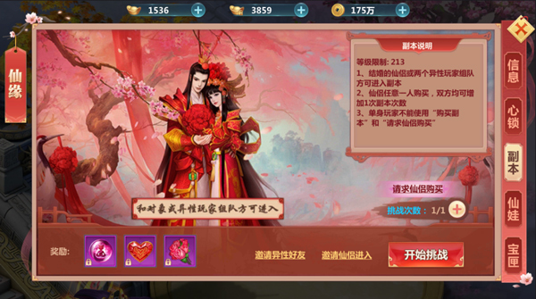 3、单身玩家不能使用“购买副本”和请求仙侣购买。