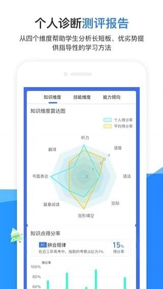 个人诊断评测报告:从四个维度帮助学生分析长短板、优劣势提供指导性的学习方式