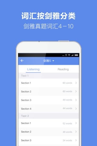 雅思考试专用APP:从词库的选取(剑雅和真题中的高频词汇)到功能的设置(剑雅核心单词,同义词归类,听力写作学科分类)根据雅思考试特点量身定制。