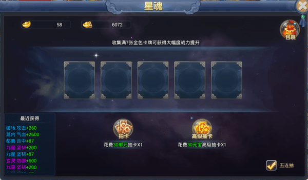 高级抽卡,使用元宝抽卡方式,可获得高品质卡牌的概率大大提高,并且至少可以获得橙色卡牌,高级抽卡还有概率获得特殊的流星卡,能直接获得大量星魂,抽到星魂卡,该卡自动炼化转化为大量的星魂值