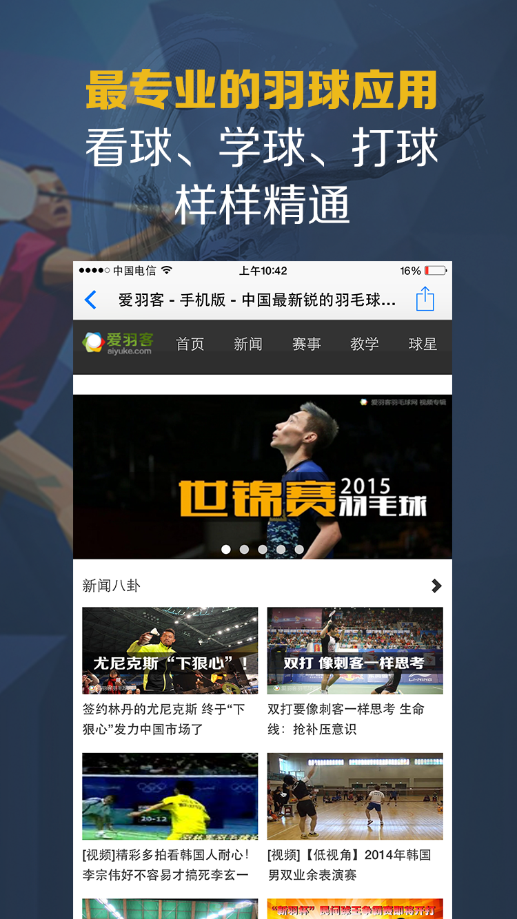 羽毛球爱好者的必备利器,国内专业的爱羽客羽毛球网官方APP。看球、学球、打球统统搞定!