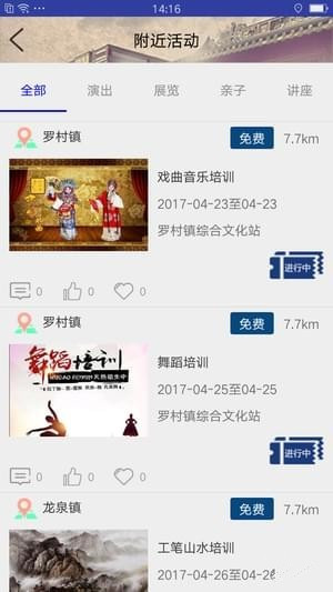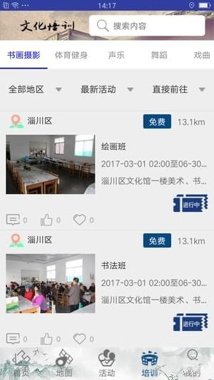 淄川文化云app整合利用全区海量文体资源,充分发动国家、省市级艺术大师、教师、老干部、老艺人、非遗传承人、文化爱好者等500余名志愿者教师,依托区级文体场馆,学校,镇办综合文化体育站,以及全区350处村居文化大院、379个农家书屋、490个道德文化广场,全年开展培训、体育健身、讲座等惠民培训,让73万城乡居民共享文体惠民丰硕成果。