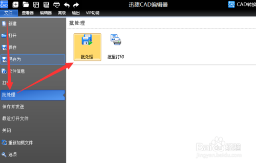 接下来教大家如何对批量的文件格式、版本进行转换。点击左上角的文件,点击下面及右边的批处理。